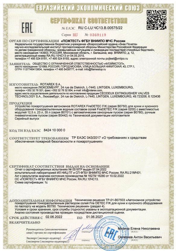 Обязательный сертификат ВНИИПО МЧС на модули газового пожаротушения МГА-ФС Обязательный сертификат ВНИИПО МЧС на автоматическую систему пожаротушения оборудования профессиональной кухни АУПТ-ФС-12,5 FlameDetec Обязательный сертификат ВНИИПО МЧС на автономные системы FireDetec F/K Обязательный сертификат ВНИИПО МЧС на линейный тепловой пожарный извещатель ИП-104/ИПЛТ ProReact Digital ТН Обязательный сертификат ВНИИПО МЧС на Модуль интерфейсный пожарный «ТЕРМОКАБЕЛЬ_ МИП2И»Производим и поставляем оборудование пожаротушения и системы оповещения, предупреждения и локализации пожара, оказываем услуги по проектированию, доставке и монтажу система пожаротушения